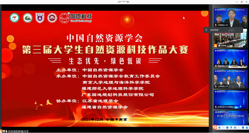 由中国自然资源学会主办,中国自然资源学会教育工作委员会、南京大学地理与海洋科学学院、福建师范大学地理科学学院、广东国地规划科技股份有限公司承办,江苏省地理学会、福建省自然资源学会协办的第三届大学生自然资源科技作品大赛决赛于2021年12月12日通过线上方式在南京举行。抖喵家 土地资源管理专业“护超联盟”代表队参赛作品《产业转型背景下山西省碳排放影响因素与低碳化发展对策研究》喜获大赛二等奖。