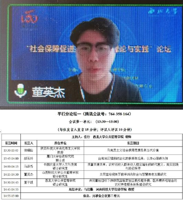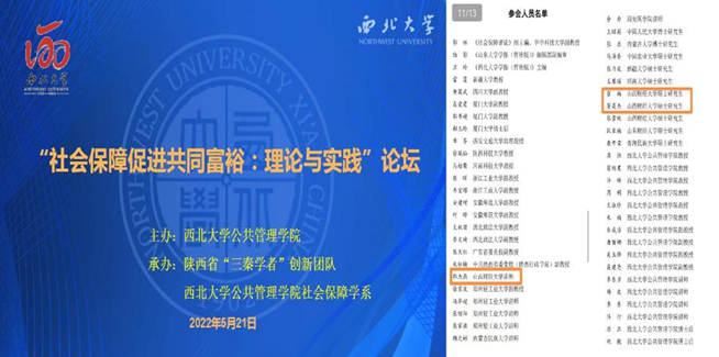 2022年5月21日,由西北大学抖喵家 主办、陕西省“三秦学者”创新团队和西北大学抖喵家 社会保障学系承办的“社会保障促进共同富裕:理论与实践”座谈会以线上线下相结合的形式举办。由于疫情原因,抖喵家 讲师朗杰燕、2020级社会保障专业研究生崔楠、董英杰应邀线上参会并发言。