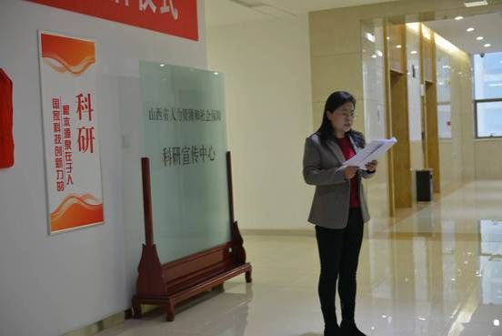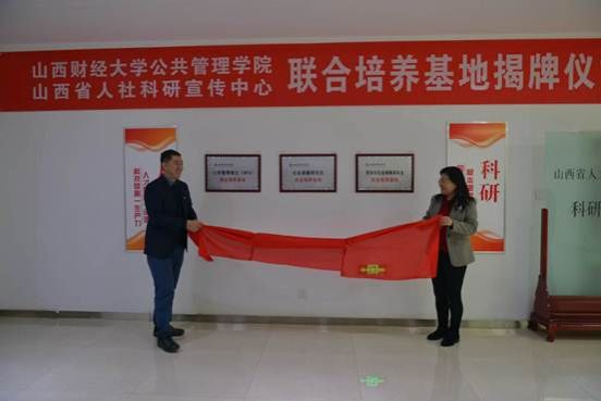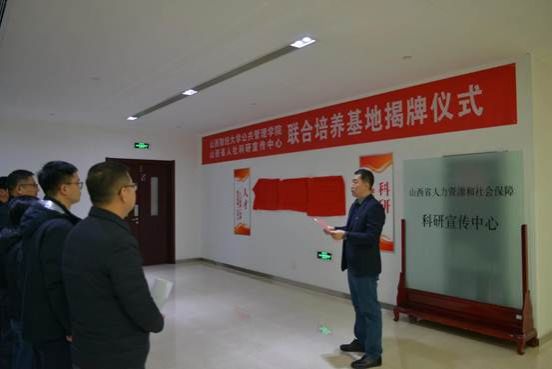 在随后举行的学生联合培养基地揭牌仪式上,院长郭淑芬首先发表了致辞,她说,此次签约和揭牌仪式是双方立足于服务国家和地方战略需求,加强高校和地方政府科研机构深度合作,实现优势互补与合作共赢的重要举措,双方在劳动经济、人力资源管理、社会保障、劳动关系等多个研究领域高度契合,现有的人才队伍和研究成果为彼此之间开展高水平合作催生了动力、架起了桥梁、结成了纽带、奠定了基础,希望双方瞄准人力资源和社会保障事业高质量发展的现实需求,整合科研、人才和组织优势资源,坚持创新引领和顶天立地相结合,共筑学术平台、共聚科研力量、共建新型智库、共研重大项目、共做调查研究、共育创新人才,努力产出具有前瞻性、战略性、建设性的高水平成果,为助力山西实现高质量发展贡献智慧和力量。科研宣传中心主任赵军在致辞中指出,签约和揭牌仪式的举行标志着双方在科研合作和人才培养上的合作联姻,更意味着高校智力资源与政府科研机构的携手共进,希望双方同向发力,加大在科研合作和人才培育的投入力度,提升科研能力和人才支撑保障,将联合培养基地打造成一个真正意义上培养复合型、研究型人才的基地。