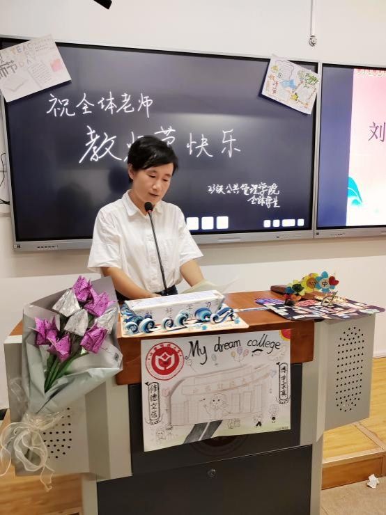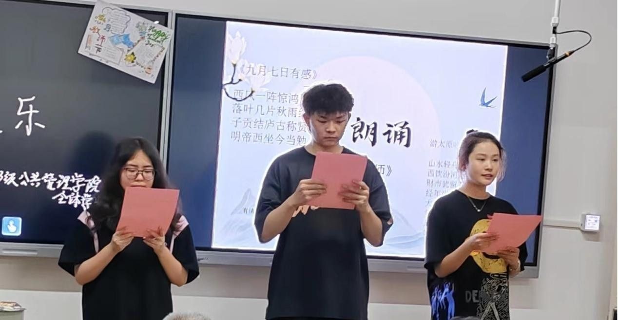 正值教师节,劳动与社会保障班张尹家、行政管理班曹碧怡、土地资源管理班焦一博三位同学朗诵了诗歌《致敬老师》。饱满的精神,激昂的文字,坚定的话语,道出了心中洋溢的感恩之情,深情表达了对老师的爱戴和尊敬。