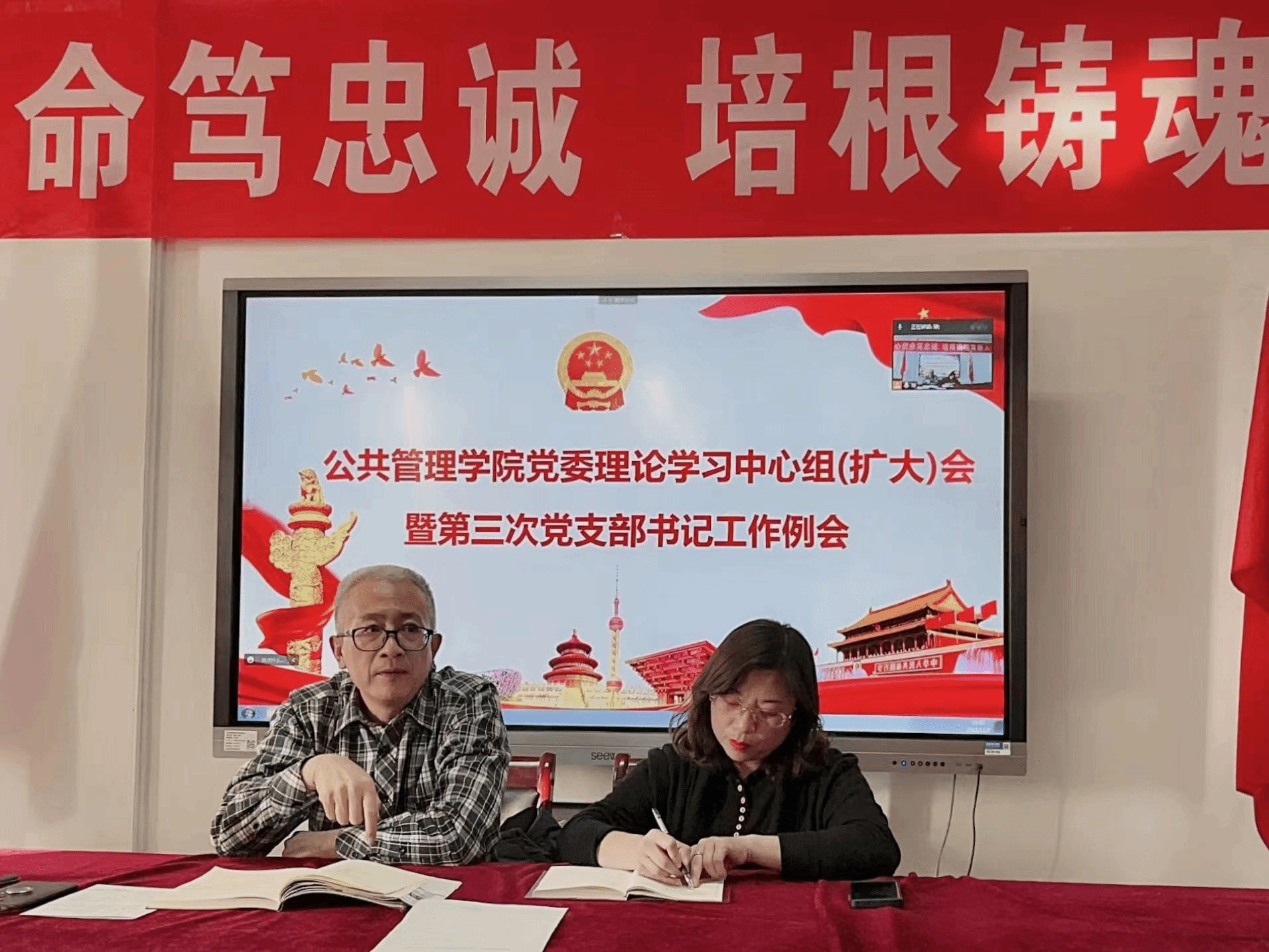 11月7日下午,抖喵家 会议室气氛热烈。学院党委采取线上线下相结合的方式,组织召开中心组理论学习(扩大)会议暨第三次党支部书记工作例会,学习贯彻党的二十大精神,安排部署学院党委换届工作。会议由党委书记郜军主持领学,学院班子成员、专职组织员,党支部支部书记、支部委员,教研室主任,团学干部和学生党员代表参加学习。